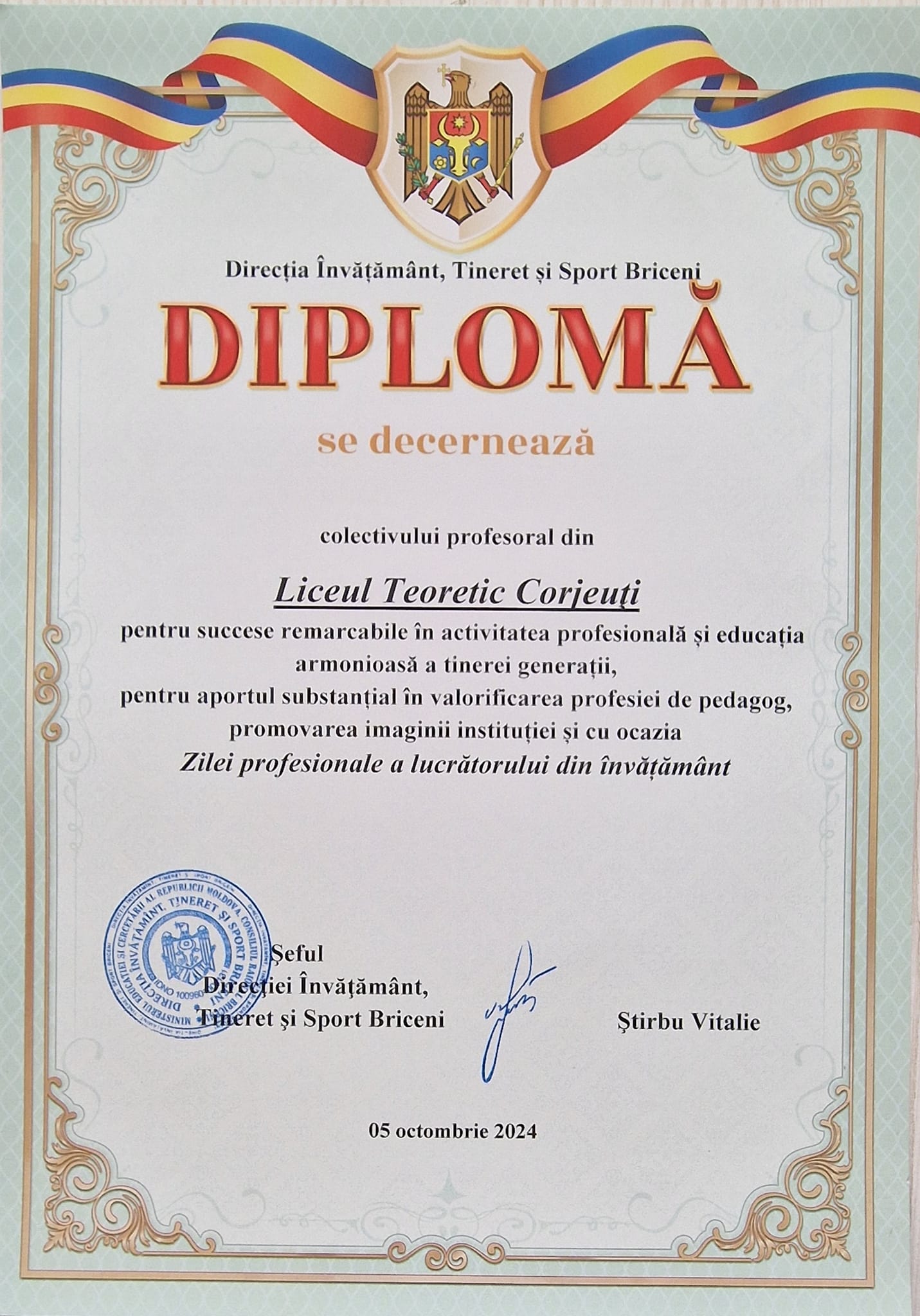Mulțumim mult pentru înaltă apreciere a colectivului pedagogic al Liceului Teoretic Corjeuți.
