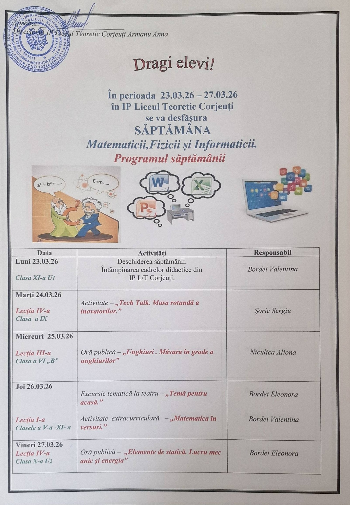 Vă adresez cele mai sincere gânduri de încurajare și inspirație la începutul Săptămânii Matematicii, Fizicii și Informaticii din cadrul IP Liceul Teoretic Corjeuți!